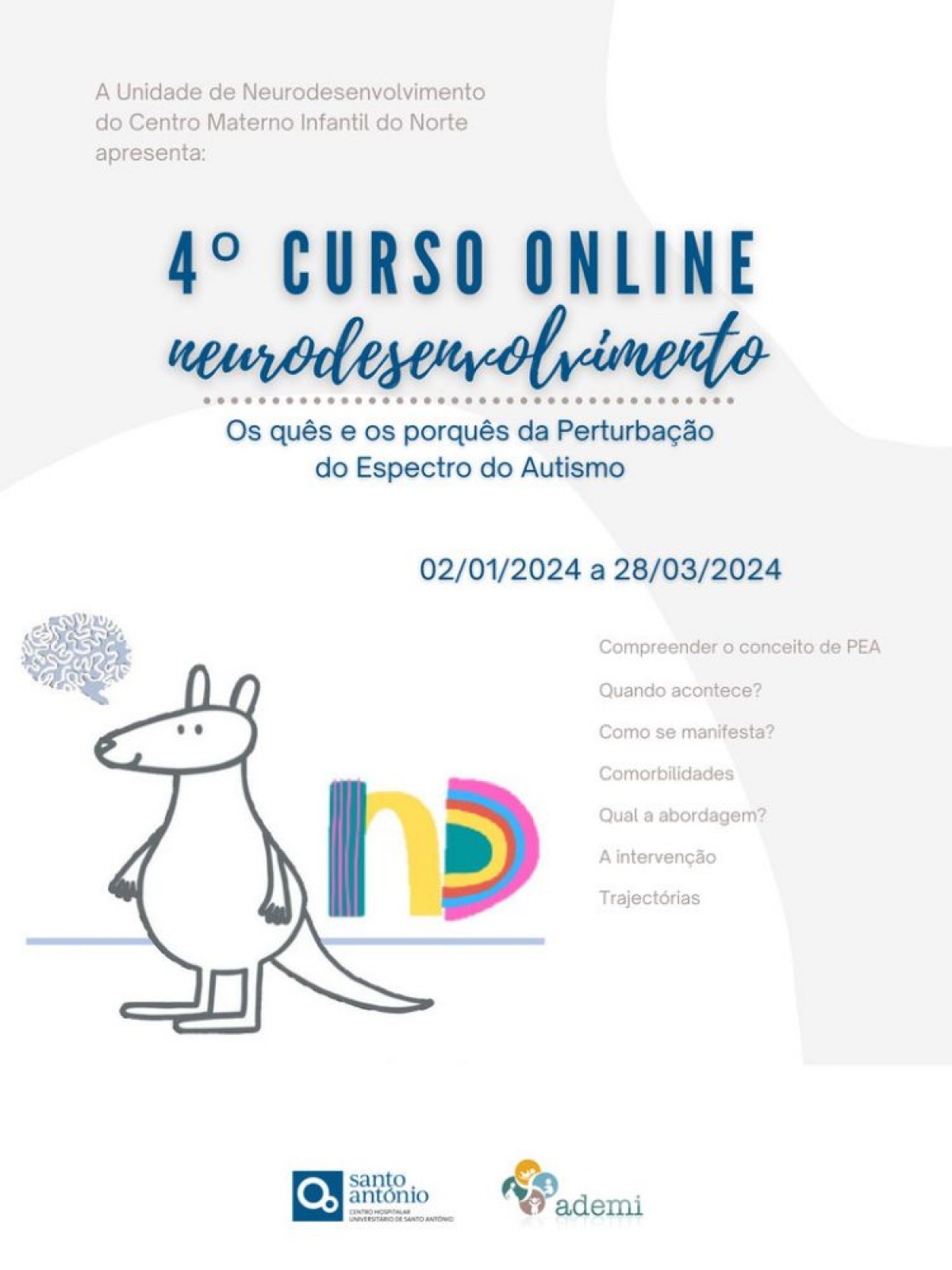 A Unidade de Neurodesenvolvimento do Centro Materno Infantil do Norte, organiza de 02/01/24 a 28/03/24 a 4ª Edição do Curso Online Neurodesenvolvimento: Os quês e os porquês da Perturbação do Espectro de Autismo.
