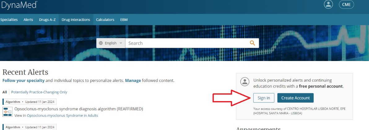 Escreva a URL www.dynamed.com na barra de endereços do seu browser e inicie sessão (sign in) com o seu login e password (criados por si através do link acima indicado).